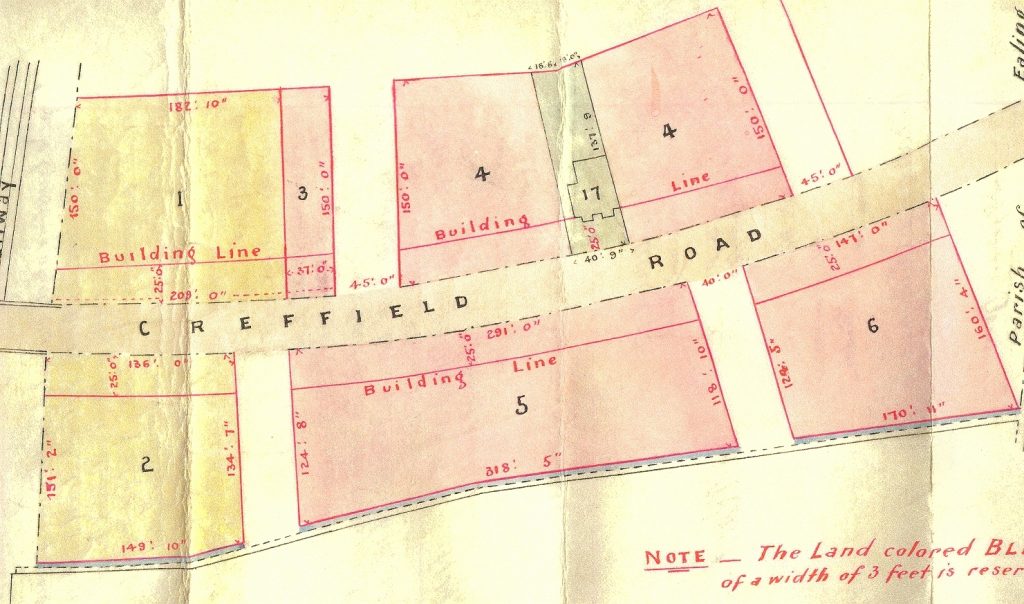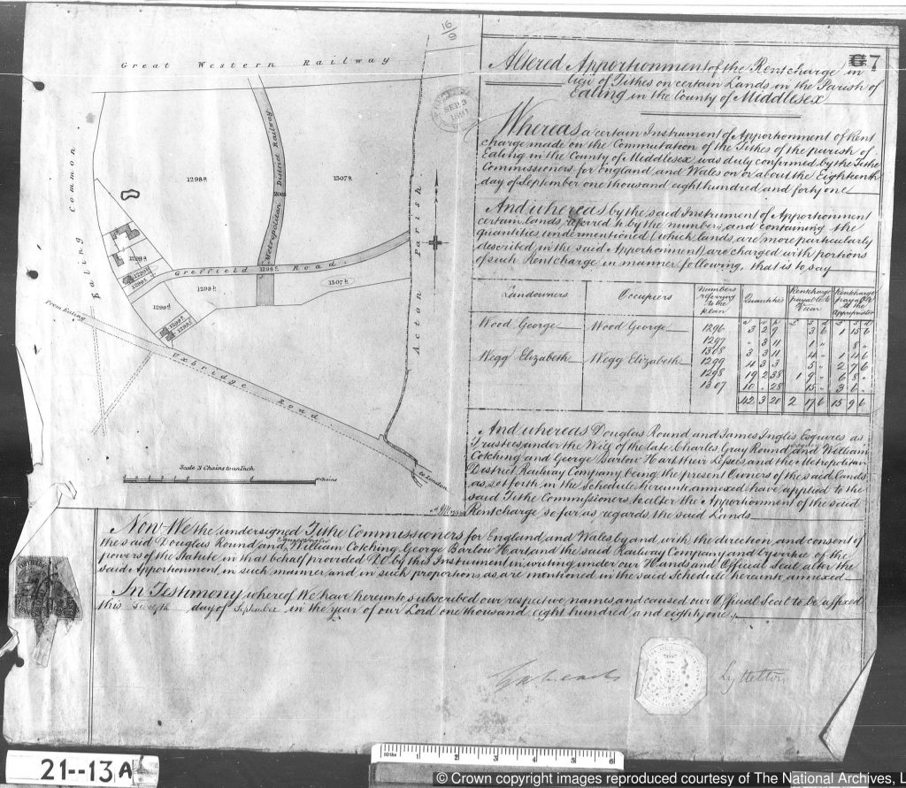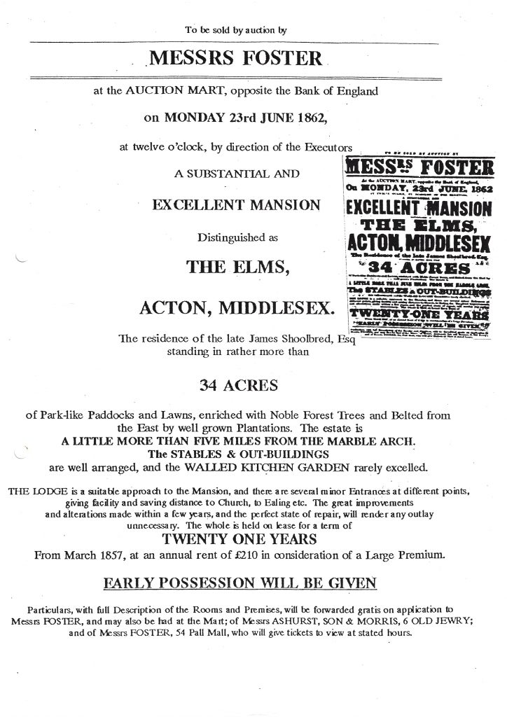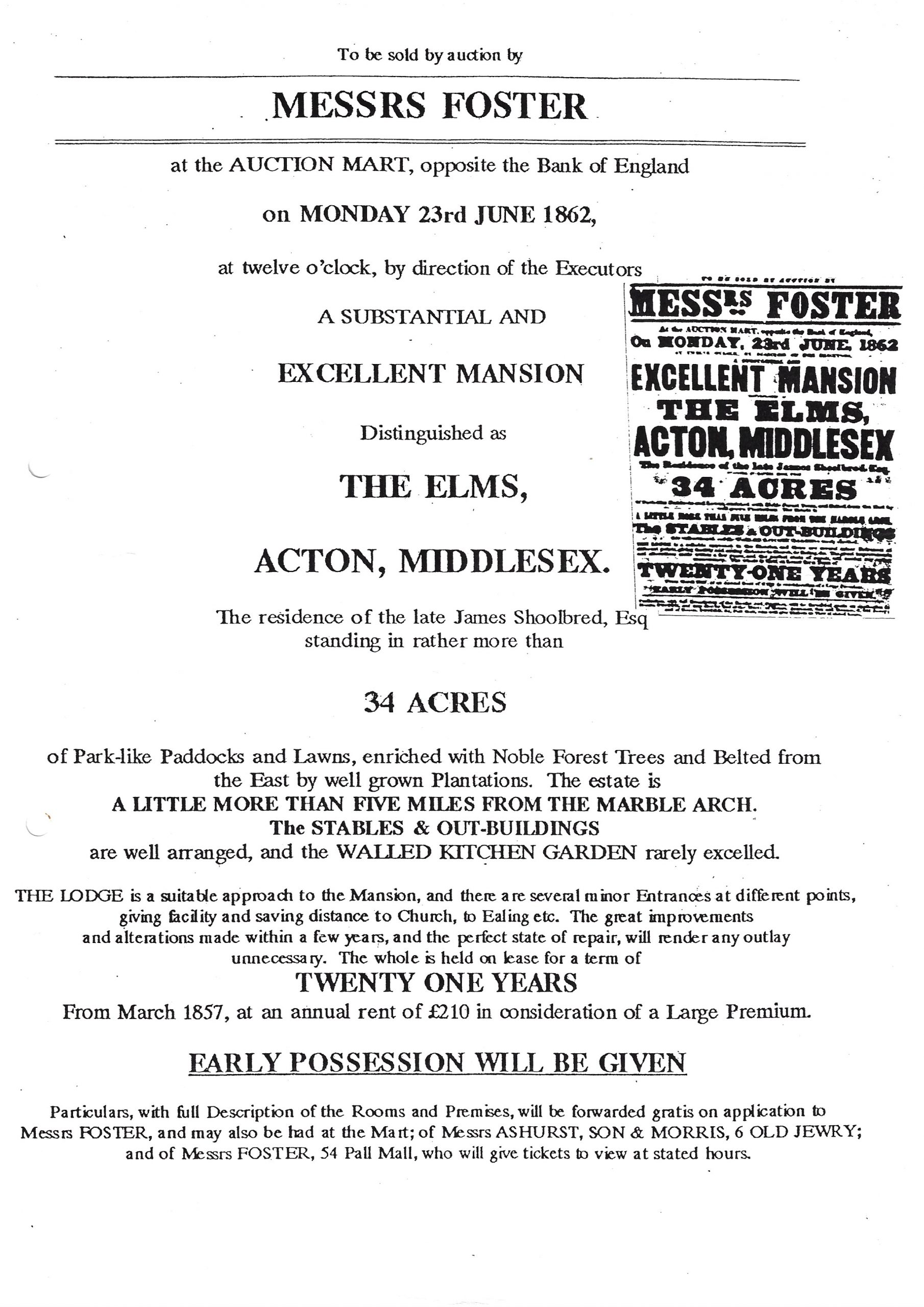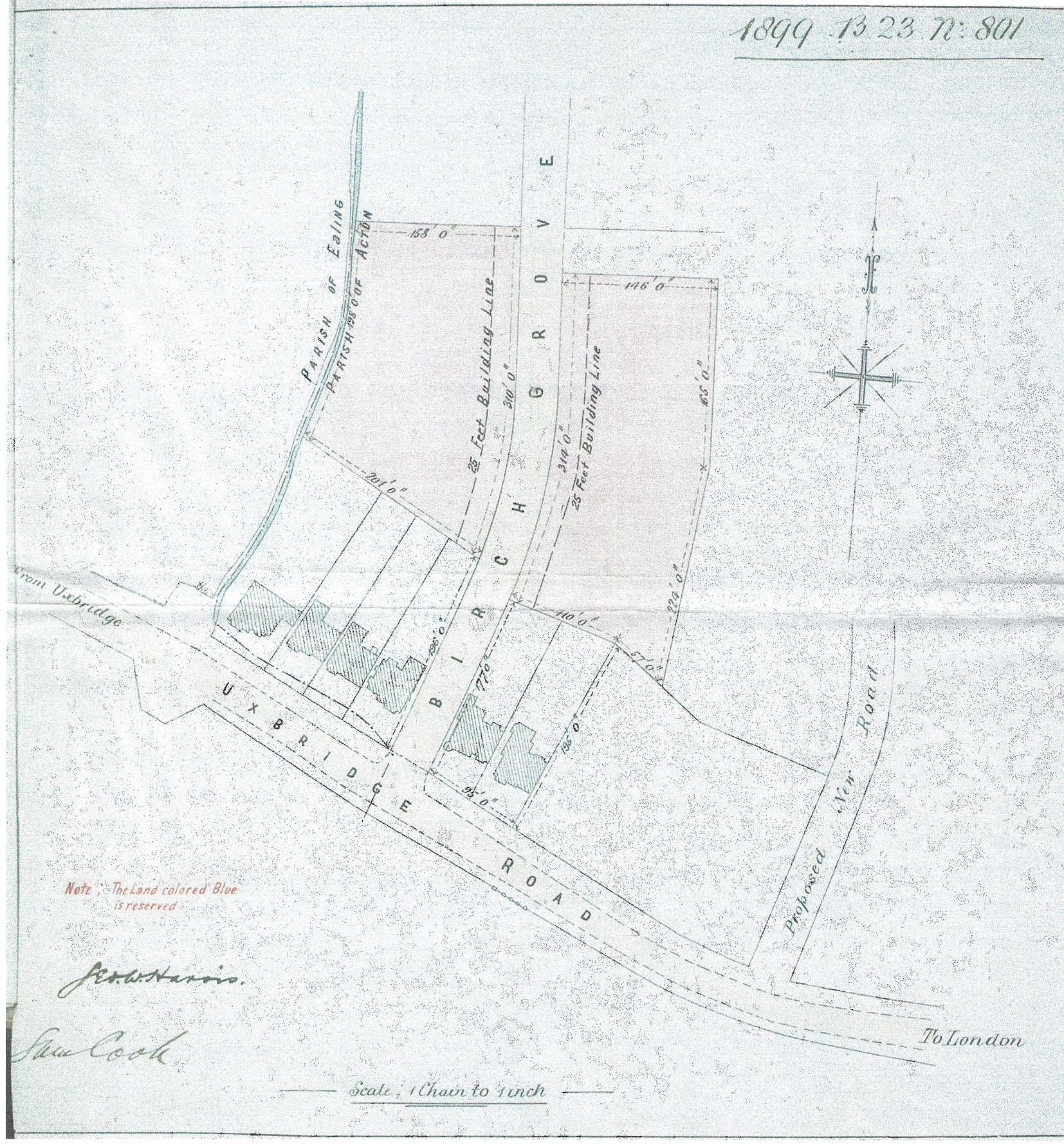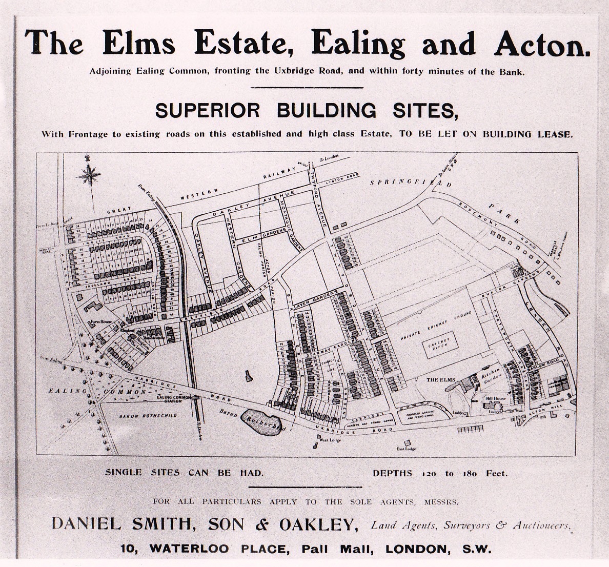 Ealing Common tithes from 1844 showing the location for Fordhook HouseActon Tithes from 1844 showing Twyford School and the ponds where Twyford gardens are todayThe Titles from the Elms Estate in 1888The Elms Auction NoticeMap of the Elms Superior Building Sites available to buyCreffield Road land sale and building line from 1900Birch Grove land sale and building line 1899 (Round / Harris map)